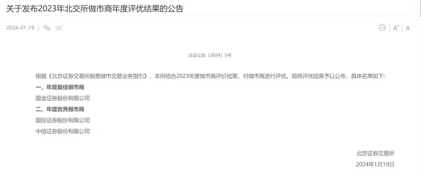 昨日,北交所发布2023年做市商年度评价结果。根据《北京证券交易所股票做市交易业务指引》,国金证券、国投证券、中信证券等荣获2023“年度最佳做市商”、“年度优秀做市商”。