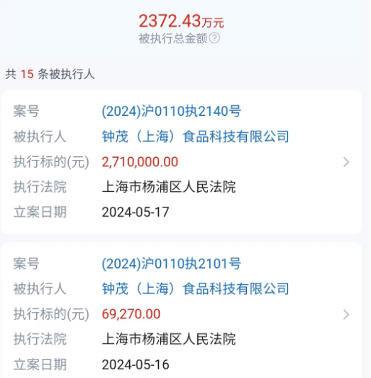 天眼查的最新资料显示,钟薛高关联公司钟茂(上海)食品有限公司本月再次出现被执行人信息,其中一条信息的执行标的金额为271万元。
