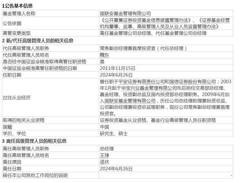 6月28日,国联安基金管理有限公司发布公告称,王琤因退休离任总经理一职,由常务副总经理兼首席投资官魏东代任公司总经理。