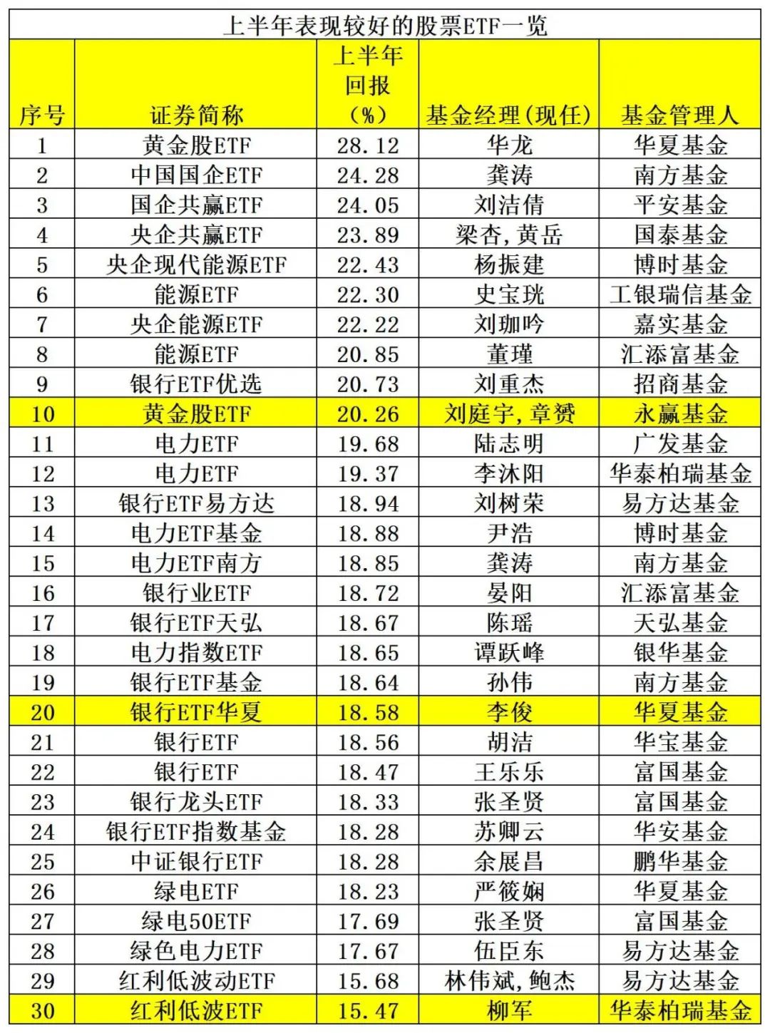 从具体指数基金表现来看,跟踪黄金的指数基金表现神勇,华夏、永赢旗下黄金股ETF今年上半年回报分别达到28.12%、20.26%。此外,跟踪央国企概念的指数基金也表现较好,如南方中国国企ETF、平安国企共赢ETF、国泰央企共赢ETF今年上半年收益率分别为24.28%、24.05%、23.89%。此外,汇添富、博时、工银瑞信、嘉实旗下能源、资源相关ETF产品今年上半年回报也位居前列,均在20%以上。