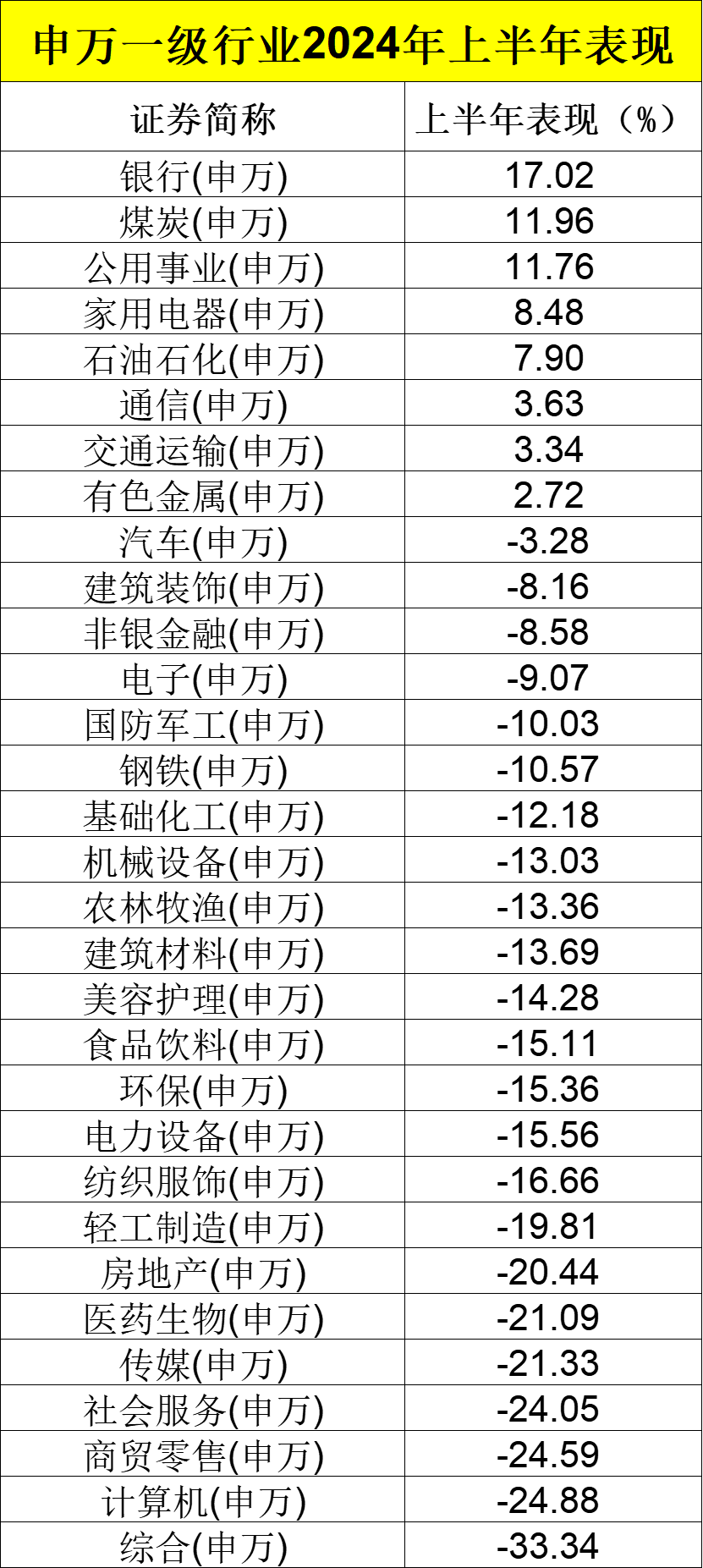 上半年整体表现突出的是红利类、资源类板块。从申万一级行业来看,银行、煤炭、公用事业、有色金属等板块涨幅超过10%,而综合、计算机、商贸零售、社会服务、传媒、医药生物、房地产等板块跌幅超过20%。
