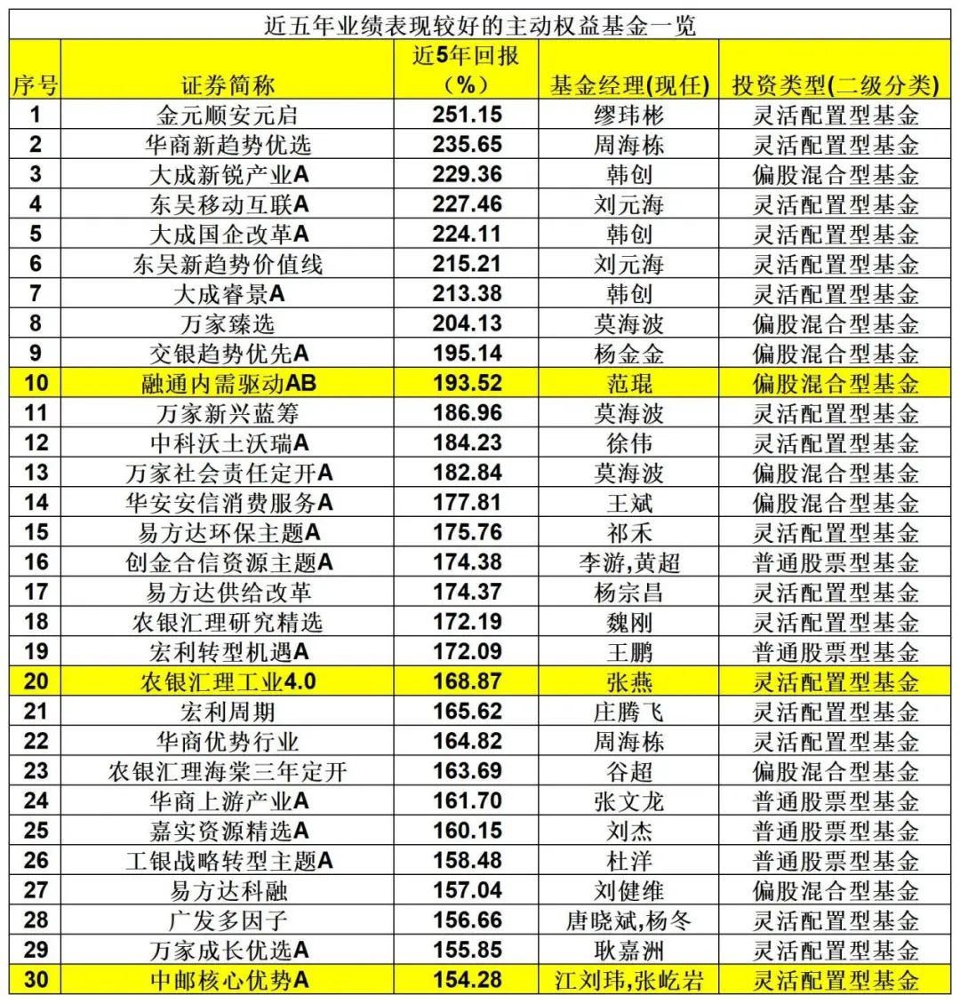 从最近五年投资来看,表现最佳的基金收益率超250%。