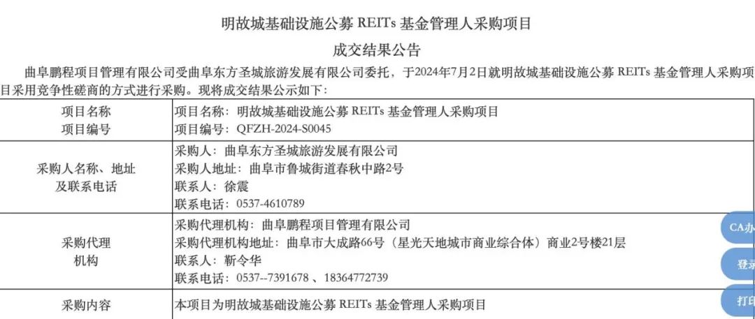 据山东曲阜市公共资源交易网显示,明故城基础设施公募REITs基金管理人采购项目日前采用竞争性磋商方式进行采购,成交供应商花落国新国证基金。