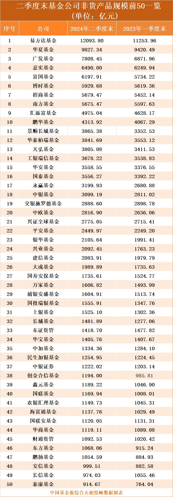 另有三家基金公司二季度末非货规模超过5000亿元,即博时、招商、南方基金,依次排在第六至第八位。