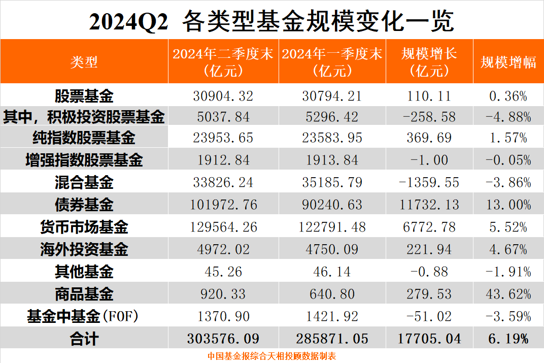 根据天相投顾对基金二季报的统计,截至今年二季度末,基金公司合计公募基金管理规模达30.36万亿元,相较一季度末增长近1.8万亿元。