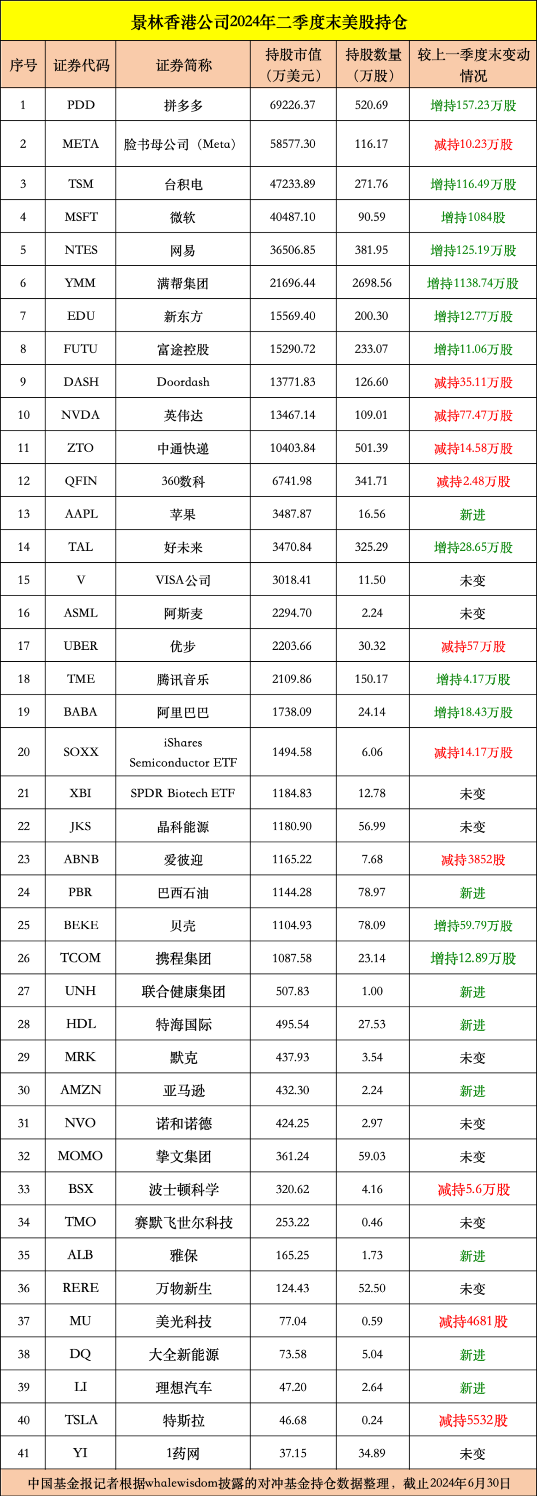 最后,基金君整理了景林香港公司2024年二季度末的美股持仓数据,小伙伴们可以看看。