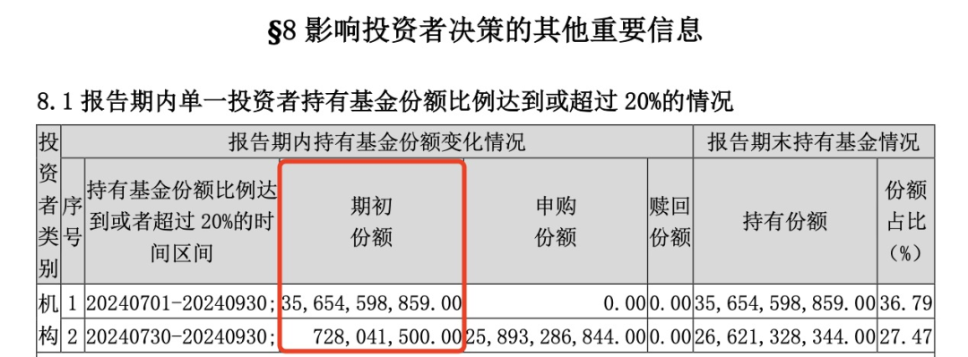 三季度末,“机构1”持有华泰柏瑞沪深300ETF的份额数量保持不变,仍为356.55亿份;而“机构2”持有华泰柏瑞沪深300ETF的份额数量由7.28亿份大幅增至266.21亿份。根据基金份额净值计算,“机构2”持有该ETF的规模由二季度末的25.39亿元大幅增至三季度末的1091.93亿元,增幅超千亿元。