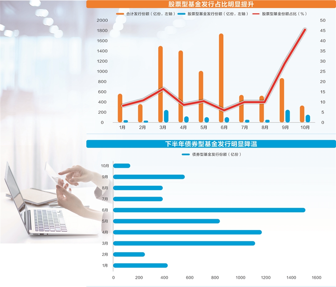 下半年基金发行数量减少,主要由于债基发行相对降温。今年上半年,债券型基金发行份额达到5361.32亿份,月均为893.55亿份,而7~10月月均发行份额骤降至371.07亿份,下降近60%。