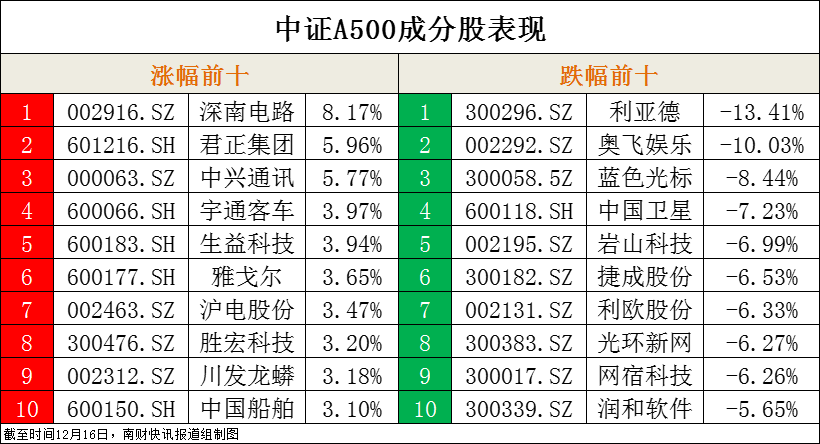 中证A500指数成分股涨幅前十、跌幅前十
