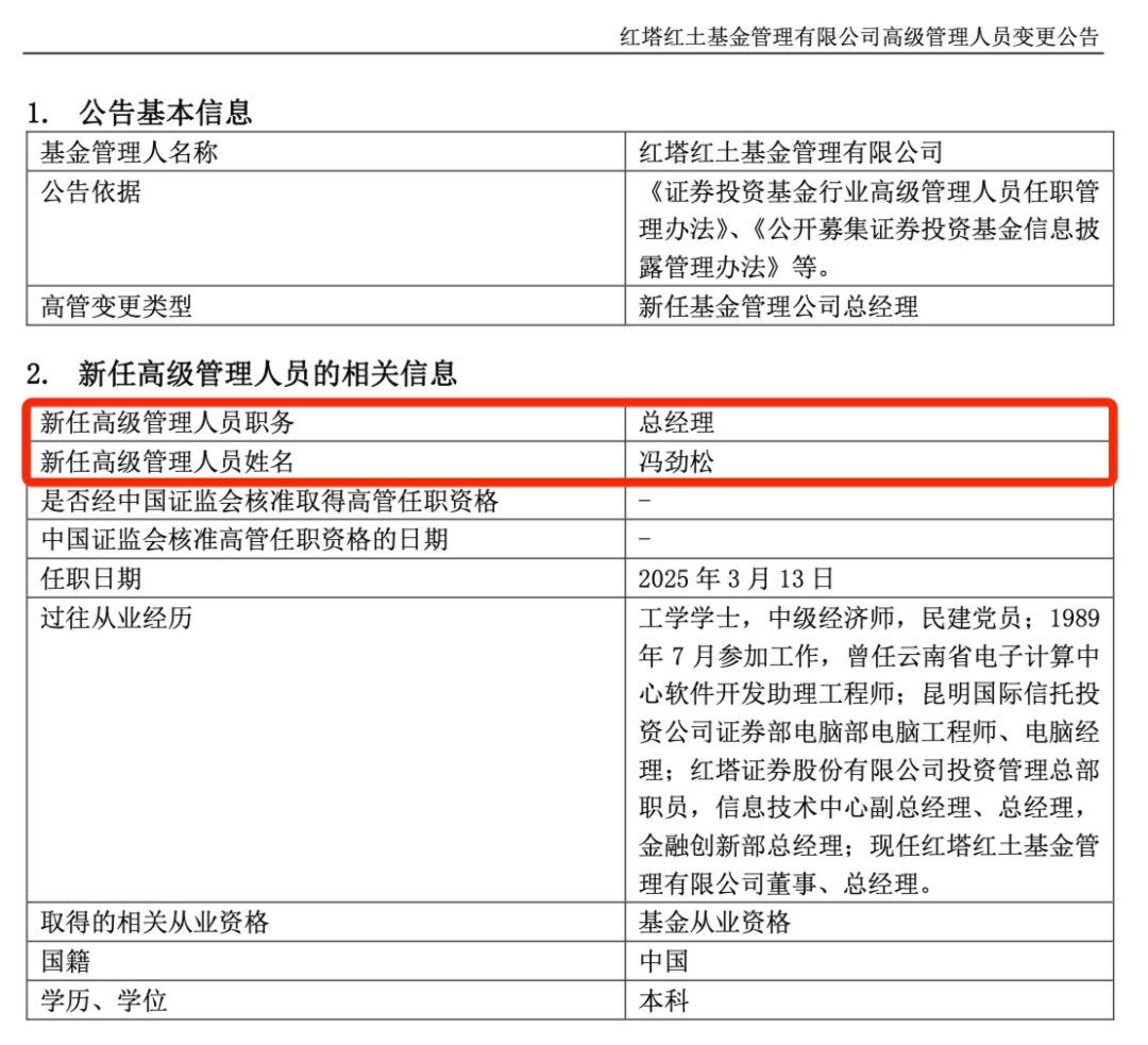 3月15日,红塔红土基金发布高级管理人员变更公告,任命冯劲松出任公司总经理。