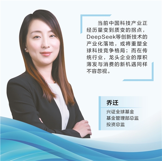 乔迁表示,当前中国科技产业正经历量变到质变的拐点,DeepSeek等创新技术的产业化落地,或将重塑全球科技竞争格局;而在传统行业,龙头企业的厚积薄发与消费的新机遇同样不容忽视。