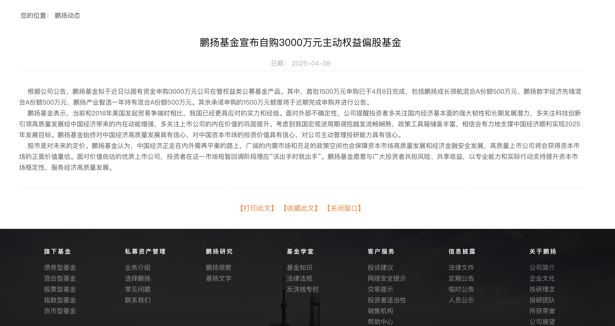 鹏扬基金管理有限公司发布公告称,拟于近日以固有资金申购3000万元公司在管权益类公募基金产品。其中,首批1500万元申购已于4月8日完成,包括鹏扬成长领航混合A份额500万元、鹏扬数字经济先锋混合A份额500万元、鹏扬产业智选一年持有混合A份额500万元。其余承诺申购的1500万元额度将于近期完成申购并进行公告。