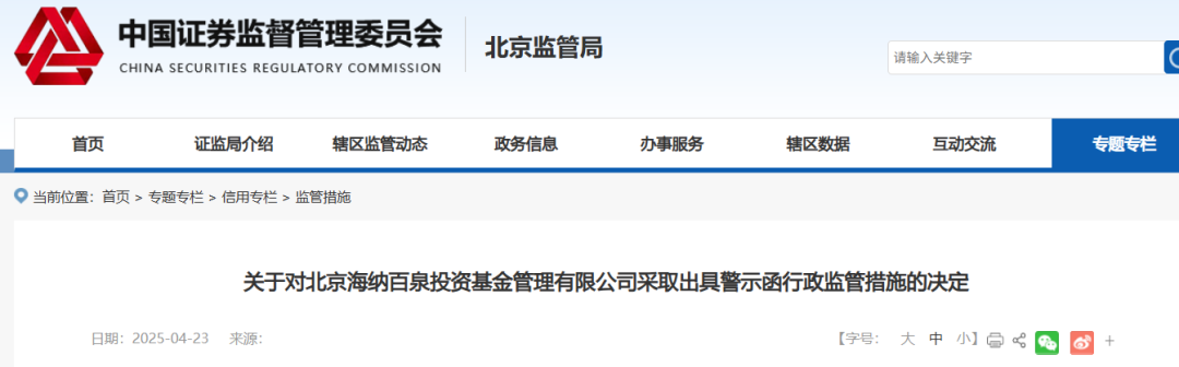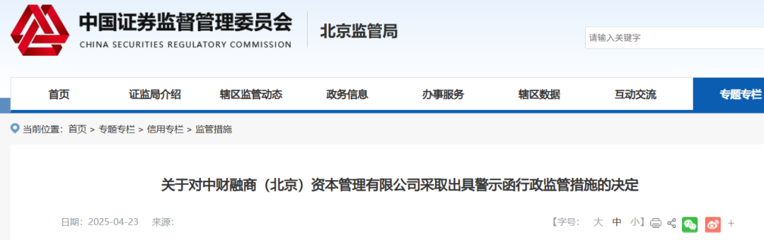 4月23日,北京证监局官网显示,北京证监局对中财融商(北京)资本管理有限公司(以下简称中财融商)、北京乾祥海泉投资管理有限公司(以下简称乾祥海泉)、北京海纳百泉投资基金管理有限公司(以下简称海泉基金)3家私募机构采取出具警示函措施,上述三家公司均违反了《私募投资基金监督管理暂行办法》相关规定。