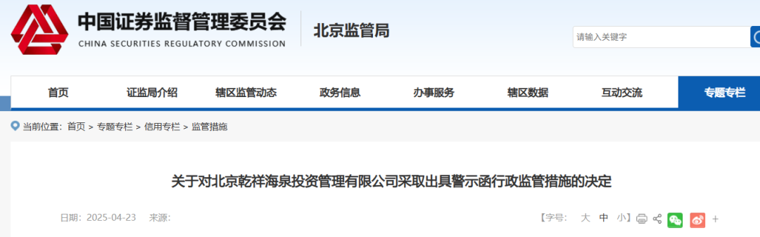 最终,北京证监局决定对乾祥海泉、海泉基金、中财融商采取出具警示函行政监管措施。