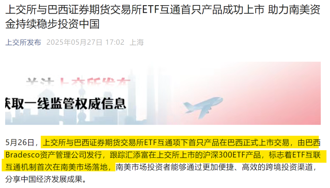 根据上交所官微信息,5月26日,巴西资管布莱德斯科与汇添富基金合作的布莱德斯科汇添富沪深300ETF(B-Index ETF Connect China Universal CSI 300)在巴西交易所成功发行,这是上交所和巴交所ETF互联互通项目下的首只ETF产品。