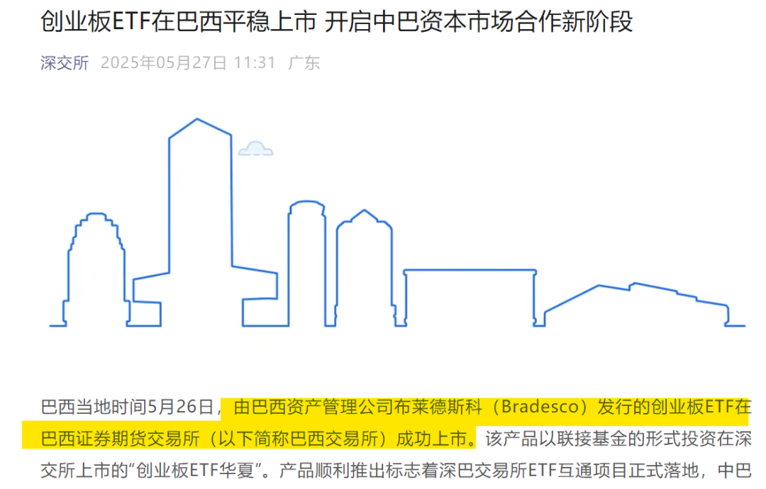 5月27日,深交所官网发布消息,巴西当地时间5月26日,由巴西资产管理公司布莱德斯科发行的创业板ETF在巴西证券期货交易所(以下简称巴西交易所)成功上市。该产品以联接基金的形式投资在深交所上市的创业板ETF华夏。