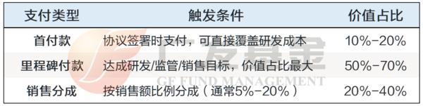 大家常说的创新药“出海”通常指的是License-out(对外授权)这一步,也就是我国创新药企在已经有某种药物的阶段性研发成果之后,把这个药物的研发、生产和销售的权益卖给海外药企,是实现风险分摊与价值变现的核心手段。作为回报,海外药企要支付我国创新药企一定费用,主要是首付款、里程碑付款(达到一定研发/监管/销售目标),以及销售分成。