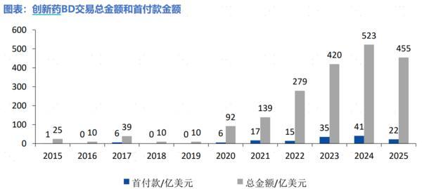 从全行业的BD交易金额来看,2025年初至今创新药出海交易总金额已达455亿美元,首付款已达到22亿美金,2025年全年有望创新高,这为未来行情打开了不小的空间。