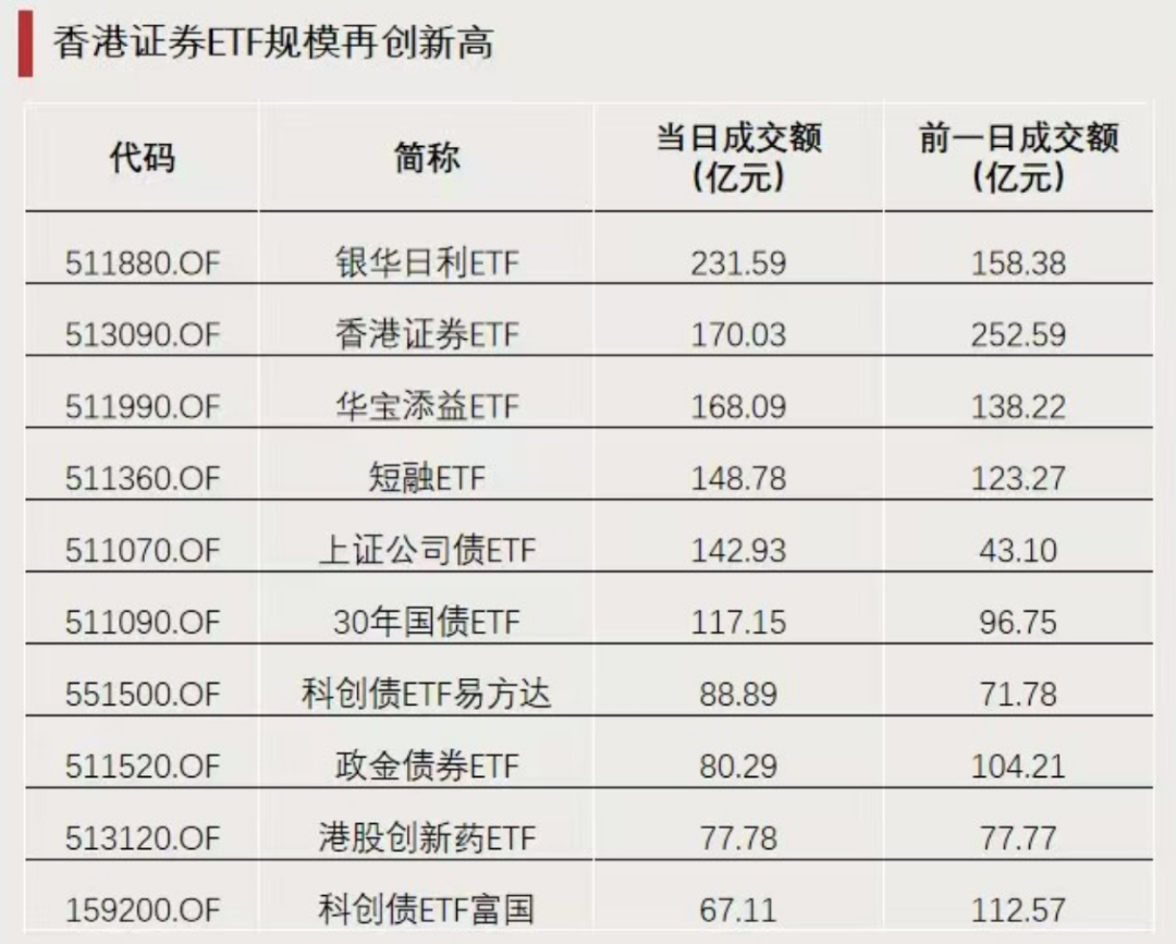 7月25日,截至收盘,ETF两市成交额3445.87亿元。具体来看,银华日利成交额突破200亿元,达231.59亿元。香港证券ETF(513090)今日成交额170.03亿元。此前两个交易日,香港证券ETF(513090)成交额均突破200亿元,居全市场ETF首位。