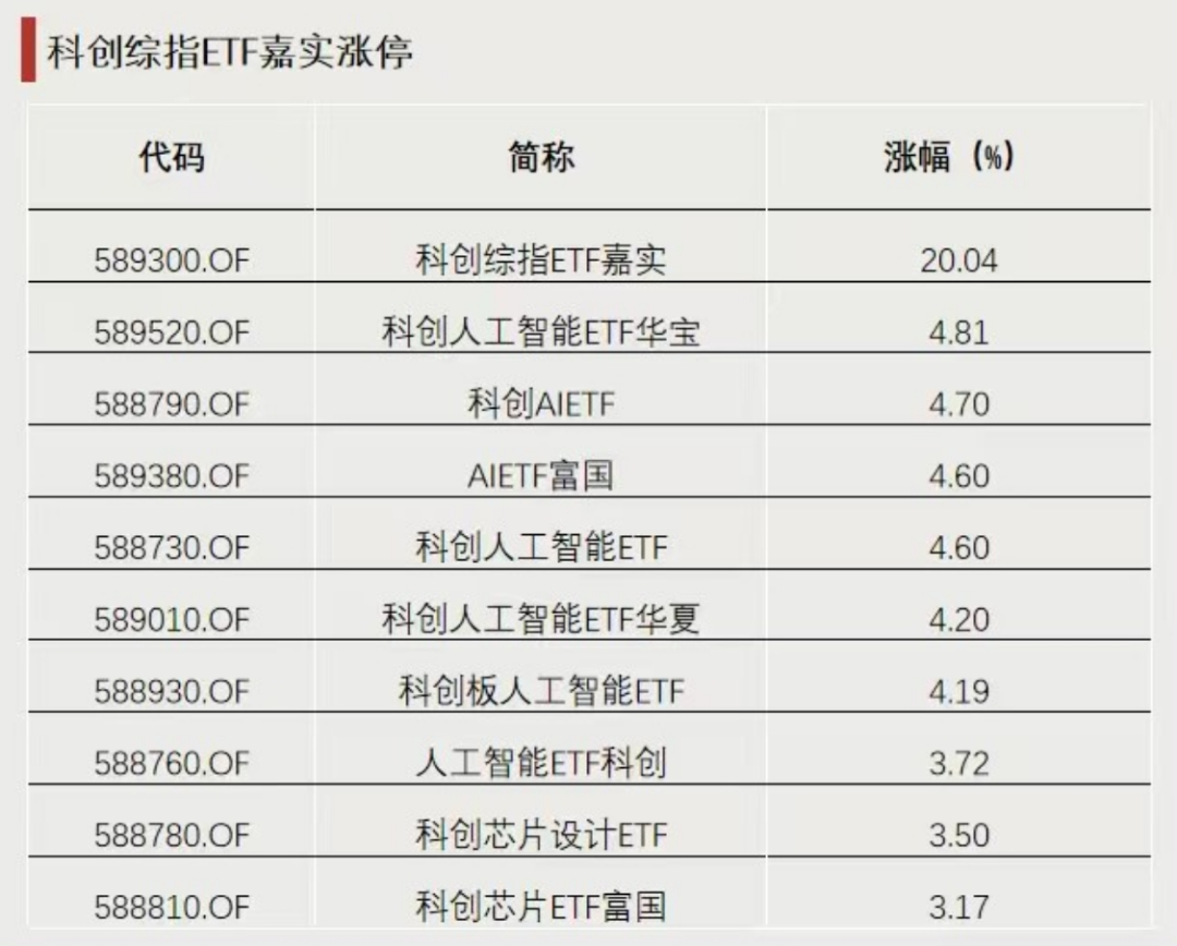 科创50指数午后在芯片股带动下逆势拉升涨超2%。科创综指ETF嘉实尾盘直线拉升涨停。涨幅前十的ETF均为人工智能、芯片等科创相关ETF。