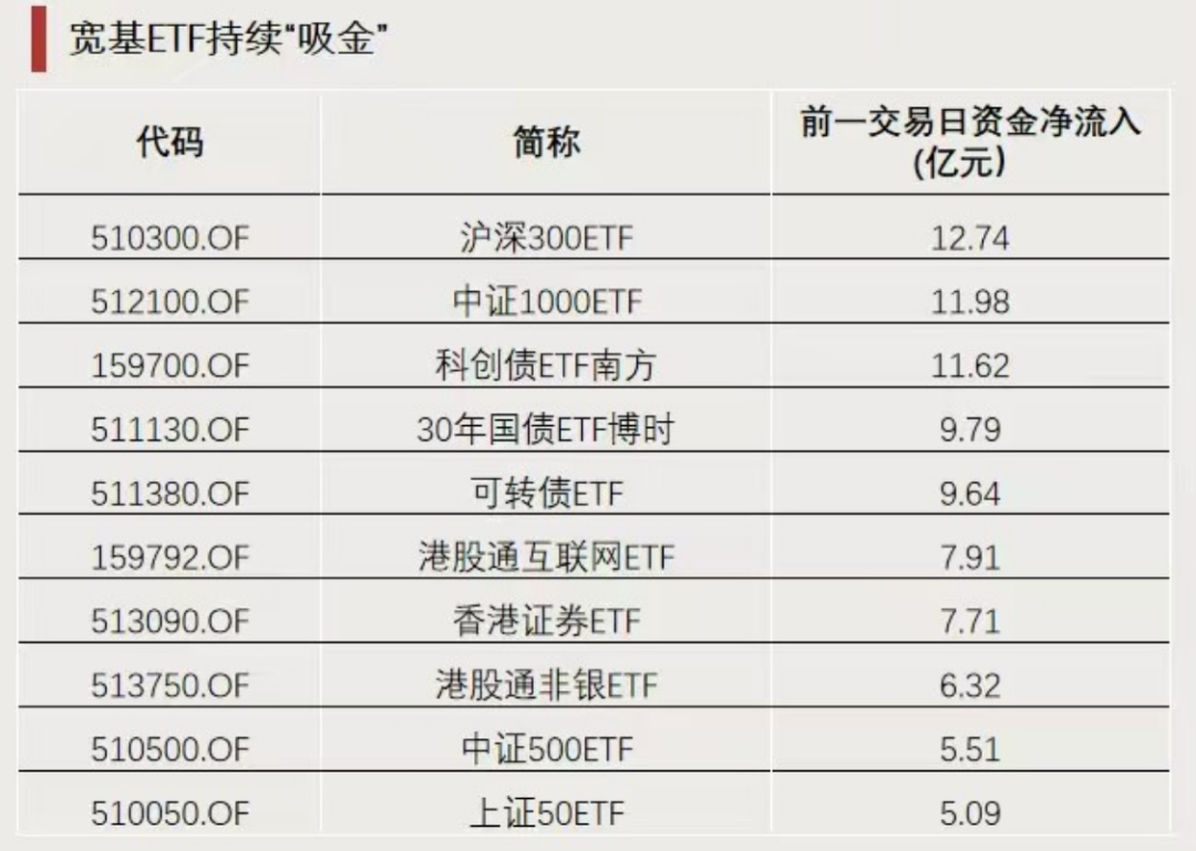 近期,核心宽基ETF持续吸金。数据显示,7月24日,沪深300ETF(510300)获资金净流入12.74亿元,中证1000ETF(512100)昨日也获资金净流入11.98亿元。