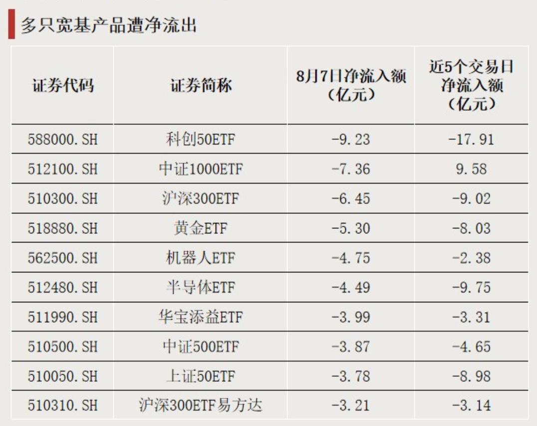 值得注意的是,以科创50ETF(588000)、中证1000ETF(512100)、沪深300ETF(510300)等为代表的多只宽基产品在8月7日遭遇较多资金净流出。这3只产品单日净流出均超过6亿元。单日净流出前十大ETF中,宽基产品占6只。