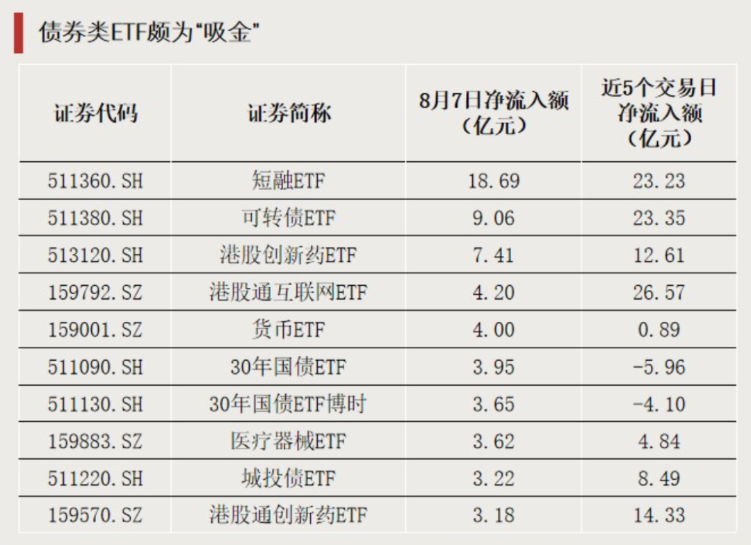 主投30年国债、城投债的部分ETF也在8月7日获得单日超过3亿元的资金净流入。