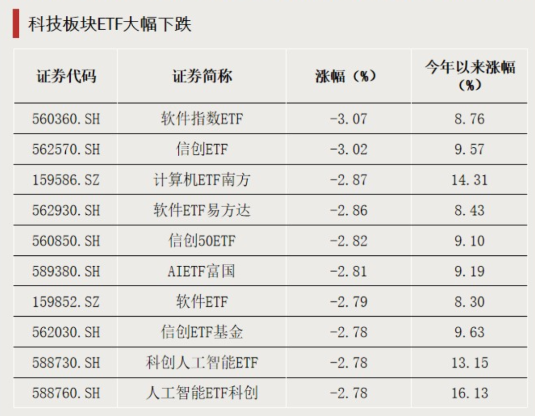 8月8日,多只科技板块ETF出现较大幅度下跌。跌幅前十的产品全部主投科技板块,涵盖软件、信创、计算机、人工智能等细分方向,跌幅均超过2.7%。