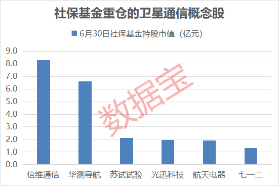 根据已公布的半年报数据,截至6月30日,6只卫星通信概念股获得社保基金青睐,信维通信(300136)、华测导航(300627)、苏试试验(300416)社保基金持股市值居前,分别为8.29亿元、6.62亿元、2.13亿元。