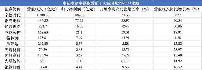 从中报业绩来看,2025年上半年电池板块的龙头公司业绩表现亮眼,电池ETF(561910)标的指数的前十大成份股2025年上半年营收全部实现正增长;而在盈利方面,阳光电源净利润同比增长超55.97%,先导智能净利润同比增长超61%。