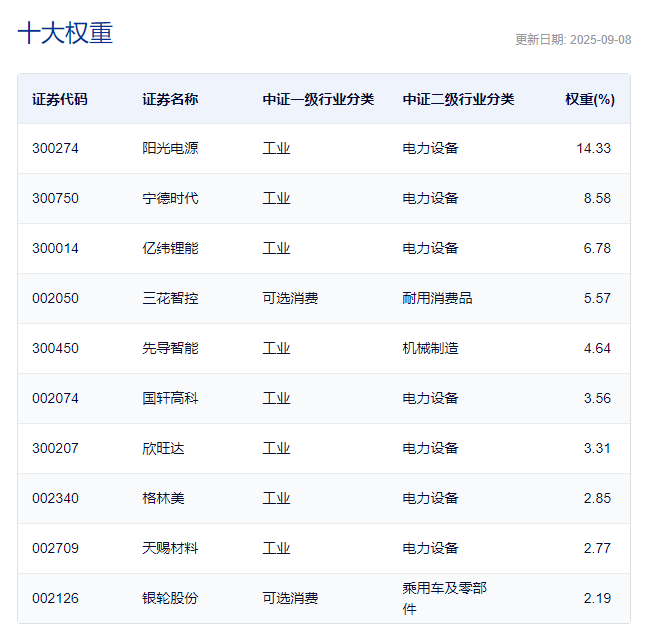 截至9月8日,中证电池指数前十大权重股包含阳光电源(300274)、宁德时代、亿纬锂能(300014)、三花智控、先导智能(300450)、国轩高科、欣旺达(300207)、格林美、天赐材料、银轮股份(002126)。
