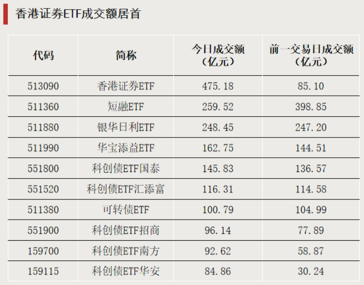 成交额方面,今天涨幅最大的香港证券ETF也是成交额最大的ETF,成交额超过400亿元。多只债券型ETF成交活跃,多只科创债ETF成交额较大,其中,科创债ETF国泰、科创债ETF汇添富成交额均超过百亿元。