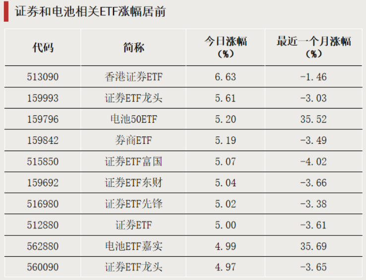 证券和电池相关ETF涨幅居前