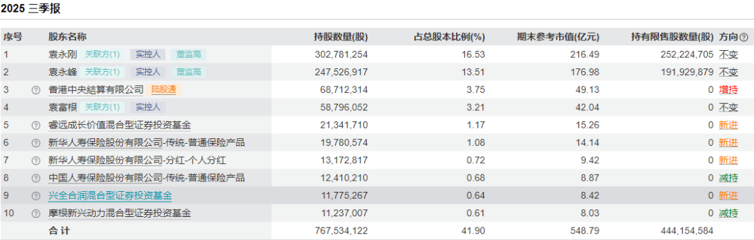其中,睿远成长价值、兴全合润均为新进前十大股东,睿远成长价值三季度的持股数量由784.88万股增至2134.17万股,兴全合润是新进持有; 摩根新兴动力三季度则是将持股数量由1246.84万股减少至1123.7万股。