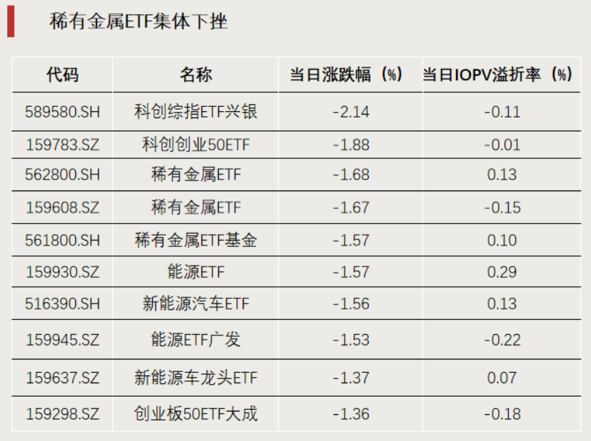 今日,科创综指ETF兴银(589580)领跌2.14%,科创创业50ETF(159783)下跌1.88%。此外,多只稀有金属和能源相关ETF跌幅居前。