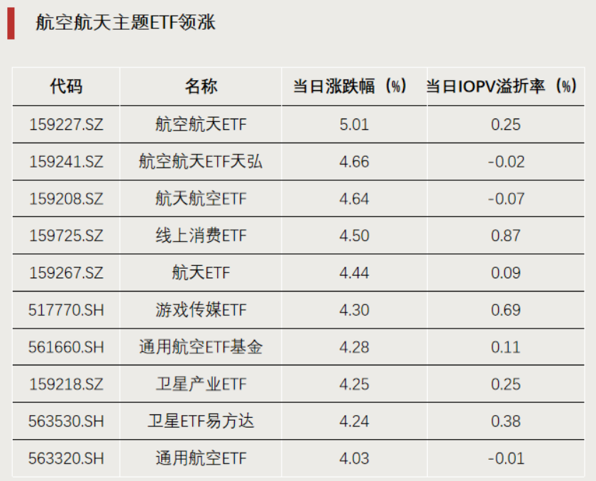 11月24日,航空航天、卫星等主题ETF强势领涨,稀有金属ETF集体下挫。