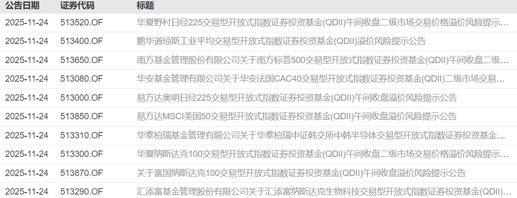 11月24日午间,华夏野村日经225交易型开放式指数证券投资基金(QDII)、南方标普500交易型开放式指数证券投资基金(QDII)、易方达奥明日经225交易型开放式指数证券投资基金(QDII)等十余只跨境ETF密集发布午间收盘溢价风险提示公告,提示投资者关注二级市场交易价格溢价风险,投资者如果高溢价买入,可能面临较大损失。