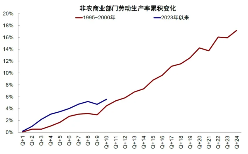 图表:当前AI带来的生产率提升幅度类似于彼时科网行情约1996~1997年时期 来源:中金公司(601995)