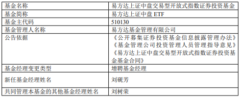 中国经济网北京12月3日讯今日,易方达基金公告,易方达上证中盘ETF、易方达上证中盘ETF联接增聘刘砚芳。