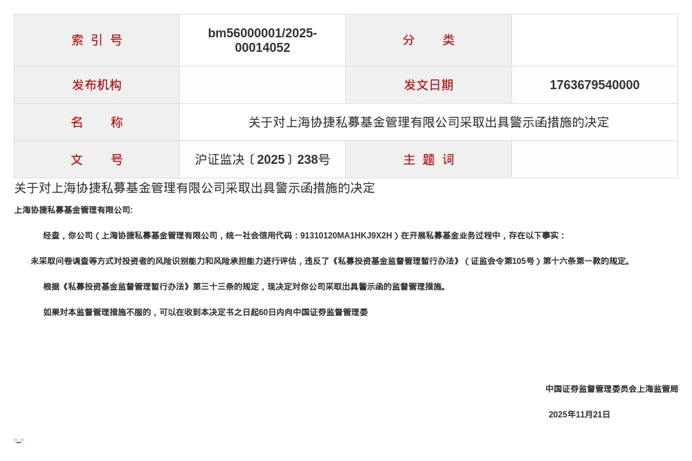 蓝鲸新闻12月5日讯,近日,中国证券监督管理委员会上海监管局发布行政监管措施决定书,剑指上海协捷私募基金管理有限公司。