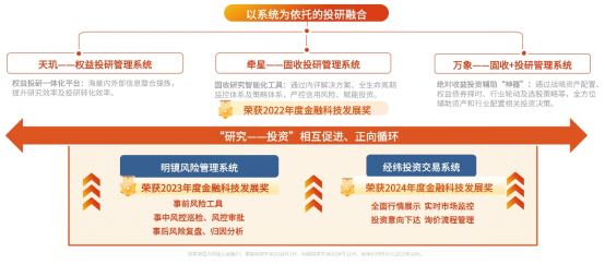 具体到投研系统方面,牵星固收投研系统,基于大数据与人工智能技术,构建智能评级、风险预警与债券策略三大模块,整合七大评级模型与信用债定价模型,实现舆情多维度追踪与多元化策略支持。天玑权益投研系统,集成内外部海量数据(603138),构建研究、投资与决策一体化平台,显著提升研究转化效率。万象固收+投研系统,围绕资产配置、股债择时与行业轮动等策略,构建“数字大脑”,辅助投资决策。