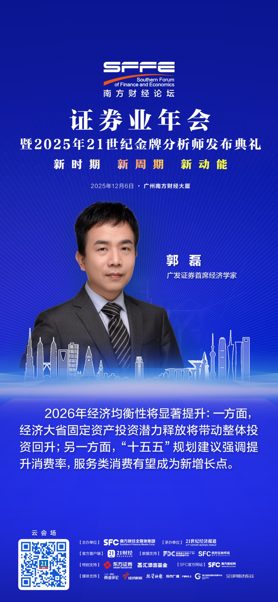 “2026年经济均衡性将显著提升:一方面,经济大省固定资产投资潜力释放将带动整体投资回升;另一方面,‘十五五’规划建议强调提升消费率,服务类消费有望成为新增长点。”在南方财经论坛2025年会证券业分论坛上,广发证券首席经济学家郭磊如是表示。