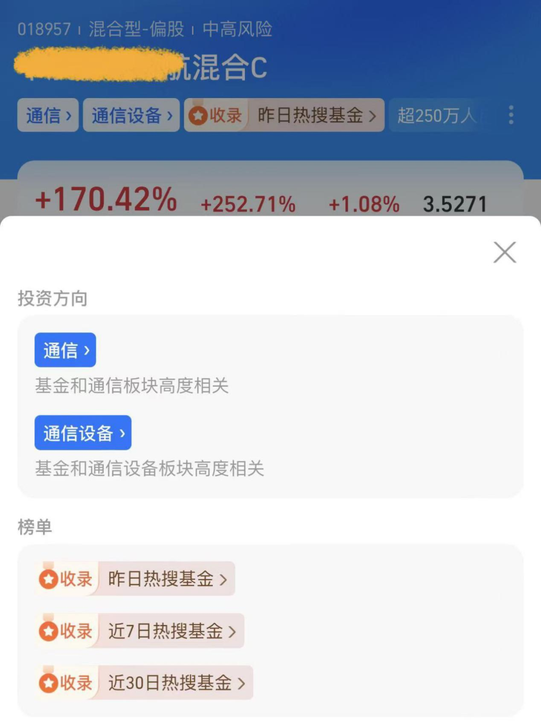 不仅如此,主动权益基金的标签中,还直接穿透到所布局的行业。以今年以来业绩较好的一只基金为例,该产品的标签是“通信”“通信设备”等,其中还明确标注出“基金与通信板块高度相关”。