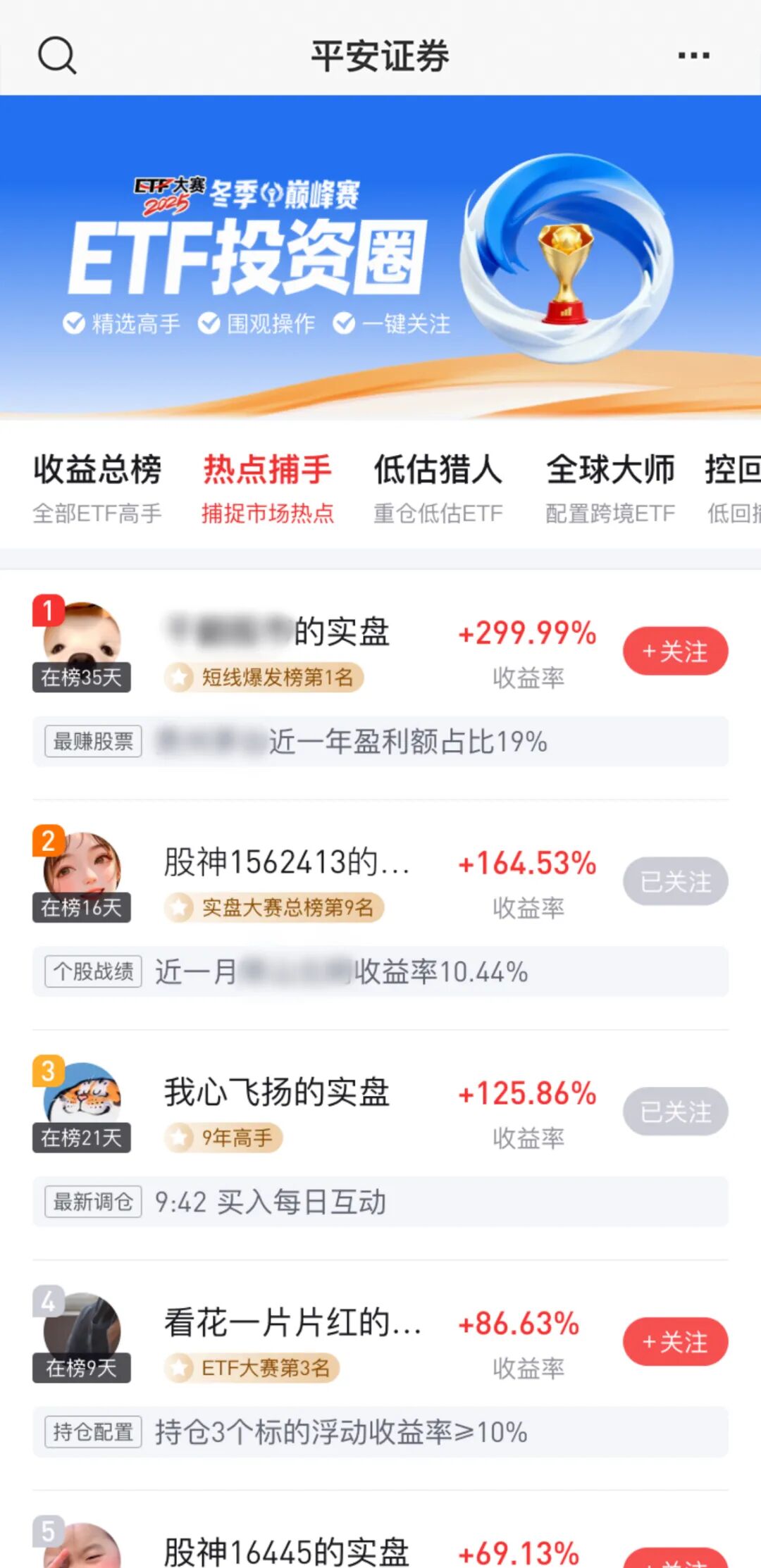 本次赛事以“找高手,加圈子”为主题,突破传统投资竞赛模式,在平安证券App上线全新的“ETF投资圈”页面,并依据策略类型划分出四大核心圈层——“低估猎手圈”“控回撤高手圈”“全球大师圈”及“热点捕手圈”。不同风险偏好与投资习惯的投资者可进入相应圈子,跟踪学习高手的持仓动态与策略逻辑,在互动中提升投资认知、增强持有信心。