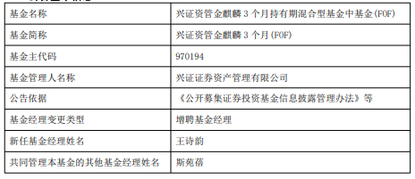 兴证资管金麒麟3个月FOF增聘王诗韵