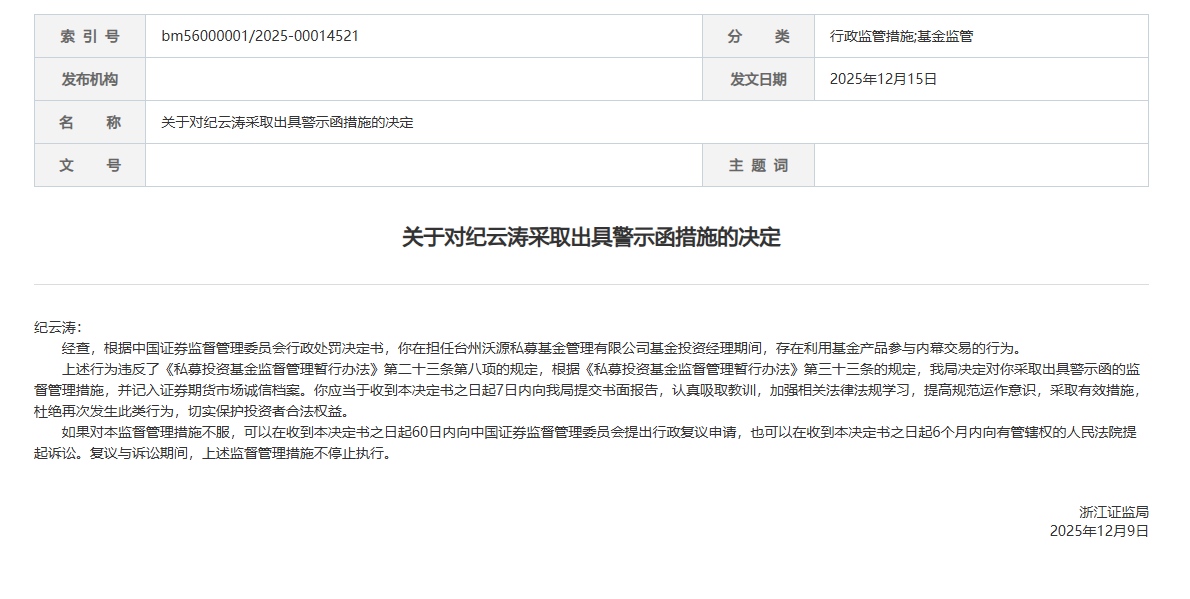 12月15日,浙江证监局网站发布关于对纪云涛采取出具警示函措施的决定。经查,根据中国证监会行政处罚决定书,纪云涛在担任台州沃源私募基金管理有限公司基金投资经理期间,存在利用基金产品参与内幕交易的行为。上述行为违反了《私募投资基金监督管理暂行办法》第二十三条第八项的规定,根据《私募投资基金监督管理暂行办法》第三十三条的规定,浙江证监局决定对纪云涛采取出具警示函的监督管理措施,并记入证券期货市场诚信档案。