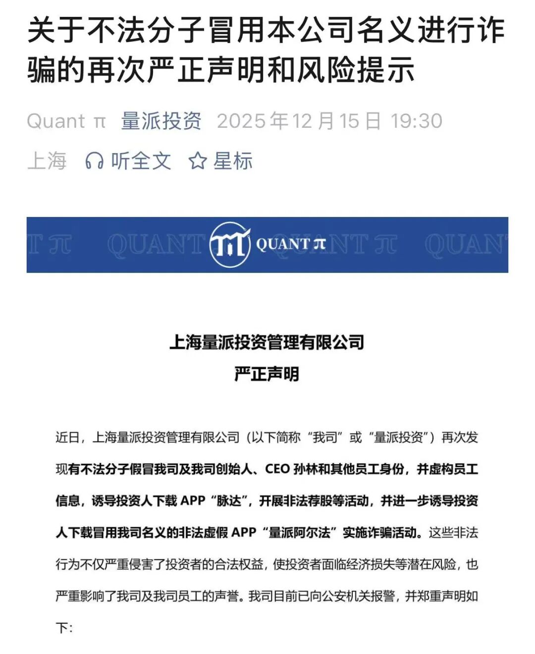 量派投资在声明中表示,近日公司再次发现有不法分子假冒量派投资及其创始人、CEO孙林和其他员工身份,虚构员工信息,诱导投资人下载“脉达”APP,开展非法荐股等活动,并进一步诱导投资人下载冒用公司名义的非法虚假APP“量派阿尔法”实施诈骗活动。这些非法行为不仅严重侵害了投资者的合法权益,使投资者面临经济损失等潜在风险,也严重影响了公司及其员工的声誉。目前量派投资已向公安机关报警。
