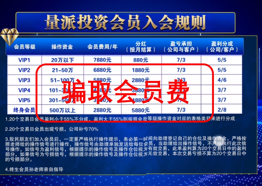 量派投资表示,公司为中国证券投资基金业协会登记的私募基金管理人,发行的所有产品均可以在中国证券投资基金业协会官网查询相关备案信息。量派投资及其员工从未组织或进行过任何培训活动、直播教学等非法活动。任何假冒量派投资及员工名义以荐股、提供内幕消息等方式向投资者邀请入会、收取费用、承诺收益、盈利分成等行为均为诈骗行为。请投资者在接受服务时注意甄别行为主体,谨防上当受骗。