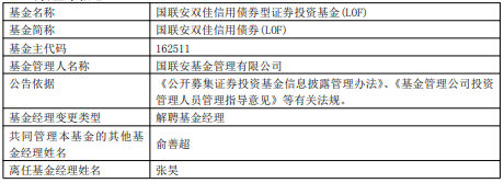 中国经济网北京12月16日讯今日,国联安基金公告,张昊离任国联安双佳信用债券(LOF),俞善超管理。
