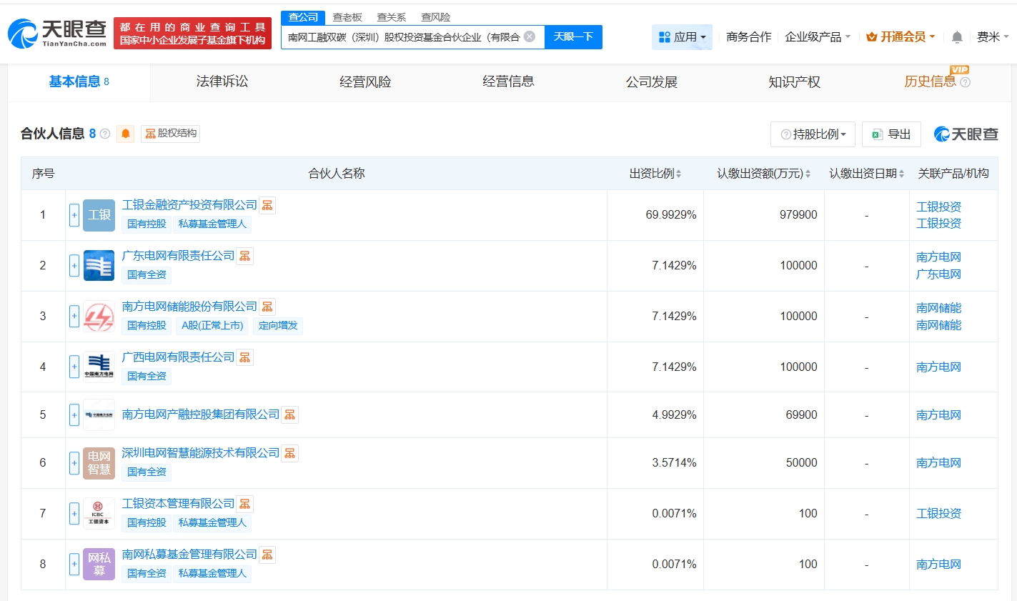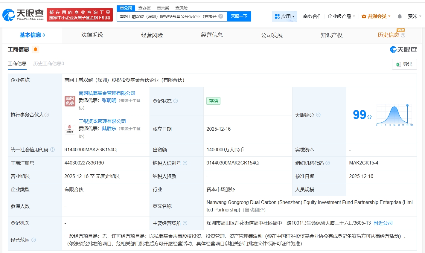 【大河财立方消息】天眼查App显示,12月16日,南网工融双碳(深圳)股权投资基金合伙企业(有限合伙)成立,执行事务合伙人为南网私募基金管理有限公司、工银资本管理有限公司,出资额140亿人民币,经营范围为以私募基金从事股权投资、投资管理、资产管理等活动,由工银金融资产投资有限公司、南网储能(600995)、广东电网有限责任公司等共同出资。